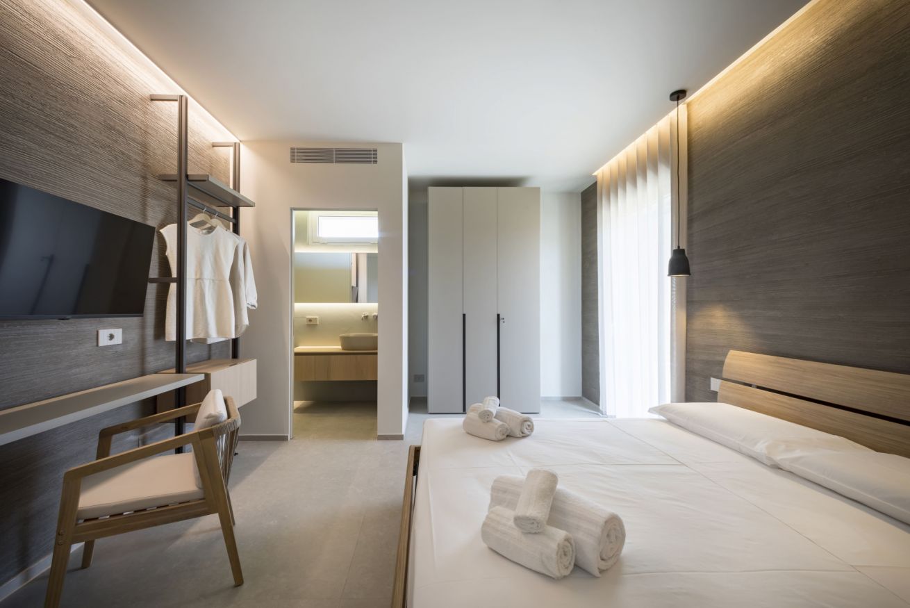 La zona giorno, luminosa e moderna, si apre su una veranda esterna privata con tavolo da pranzo, perfetta per gustare un pasto con vista mare. Tutti gli ambienti sono dotati di aria condizionata, wi-fi gratuito, smart TV (55’’ in soggiorno, 45’’ nelle camere) e rifiniture di pregio.