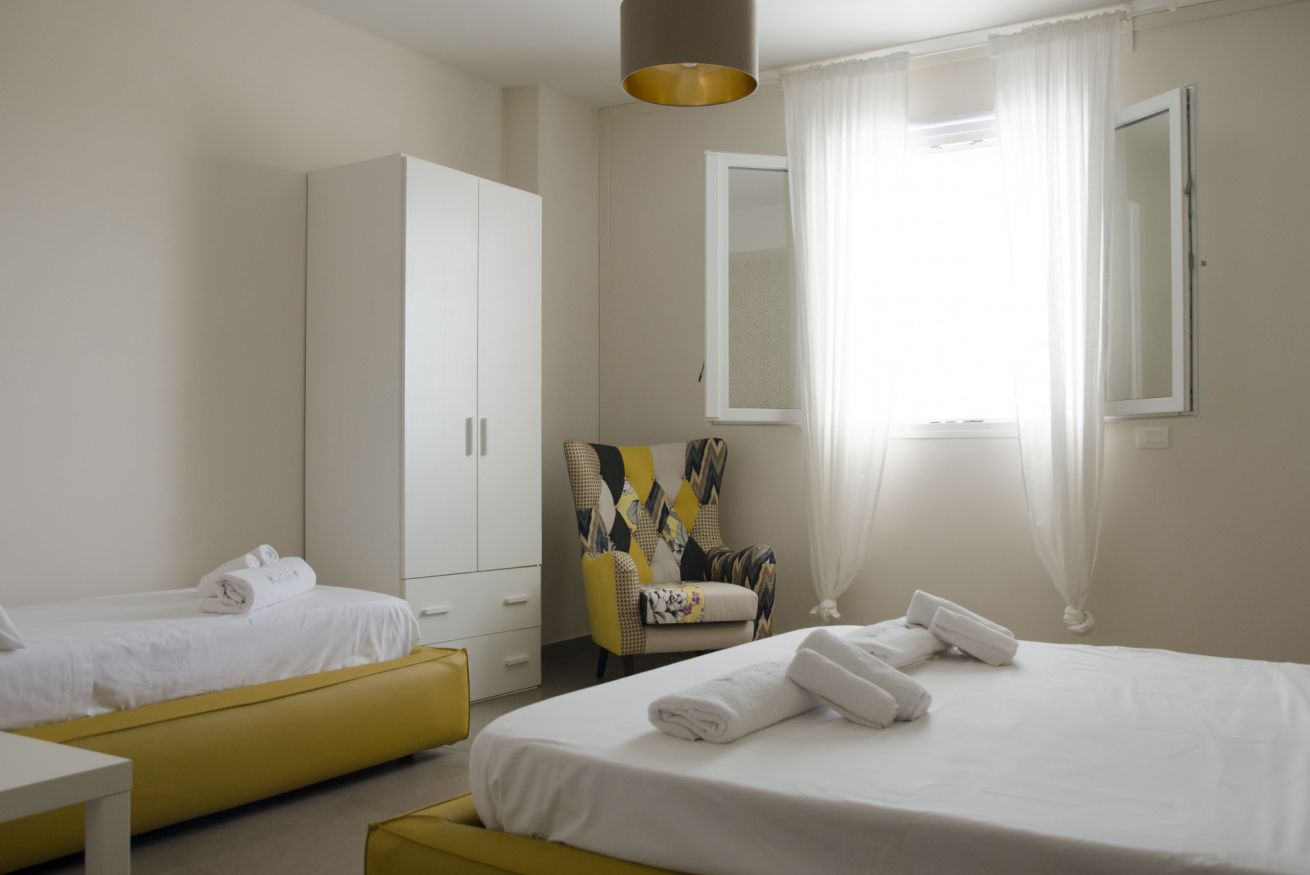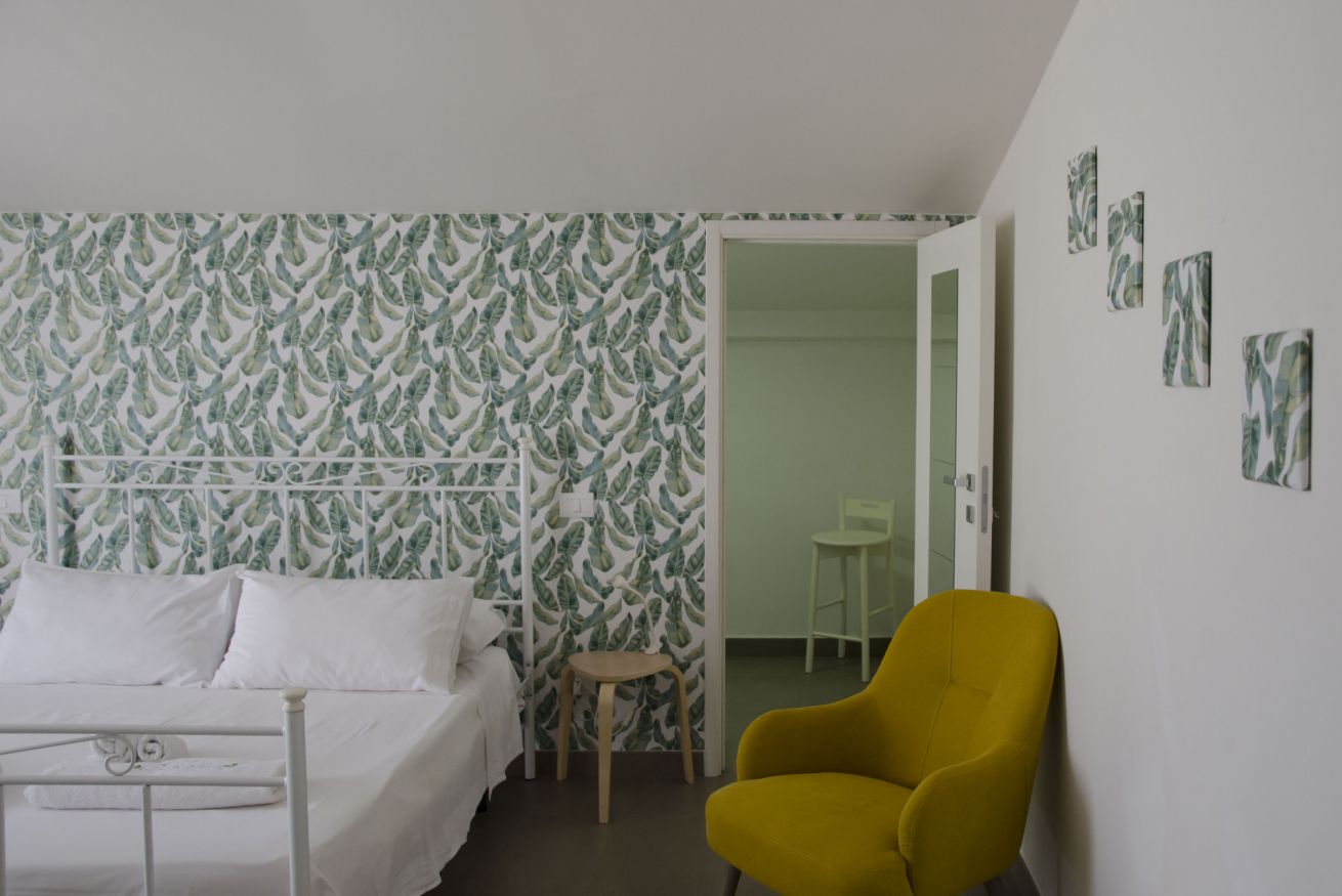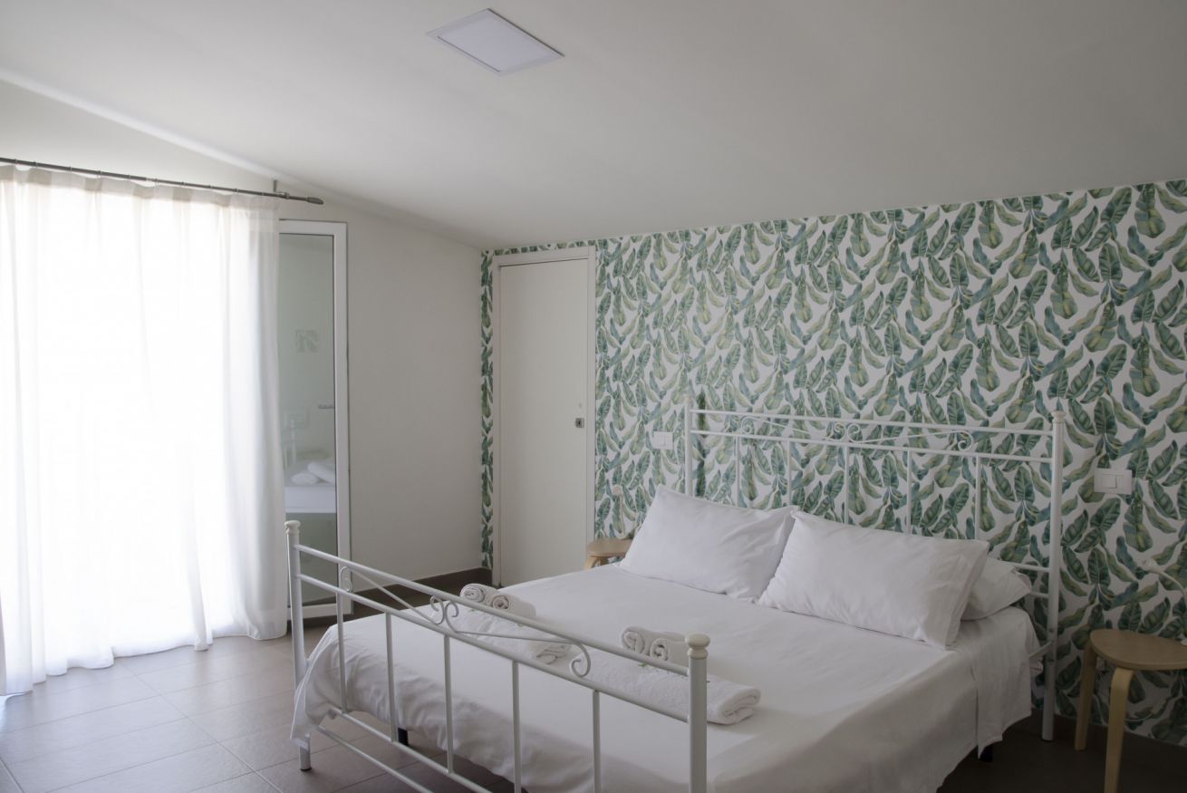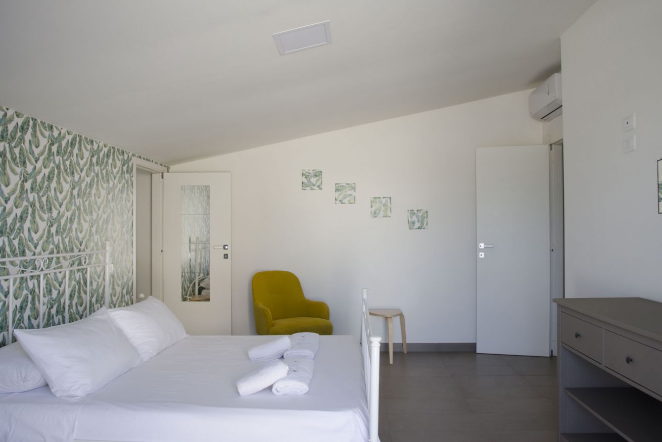 Dalla veranda si accede alla seconda camera matrimoniale indipendente, anch’essa dotata di letto matrimoniale, letto singolo, bagno completo in camera e un piccolo patio privato con tavolino per la colazione.