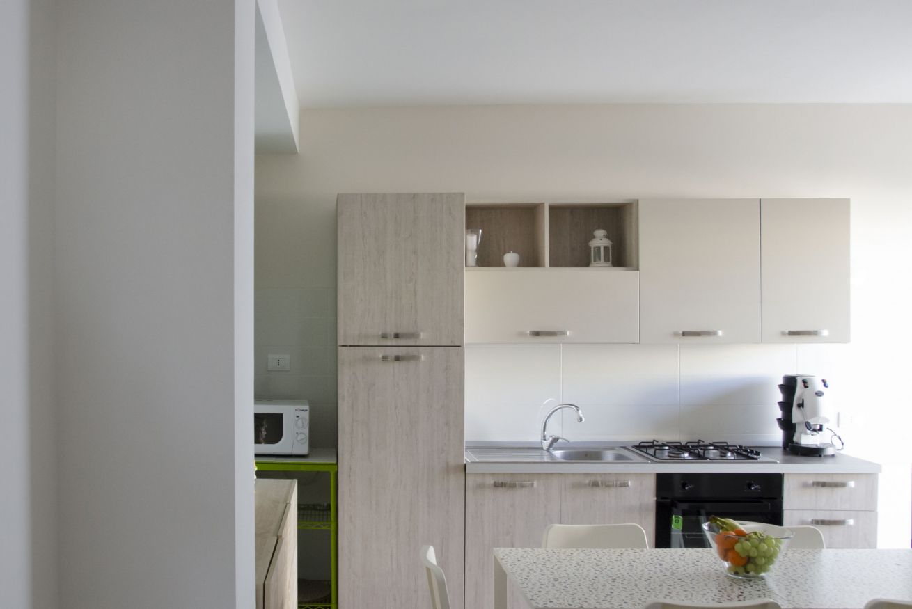Al piano inferiore troverete un’ampia zona giorno con soggiorno dotato di TV e una cucina completa di tutto: forno, microonde, macchina del caffè, moka, bollitore e utensili vari.